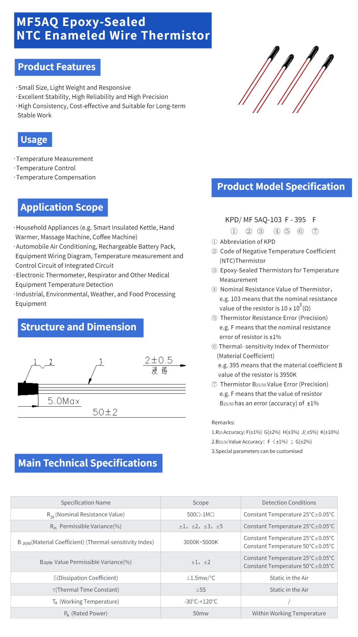 | Product Feature | MF5AQ Epoxy-sealed Enameled Wire NTC Thermistor |